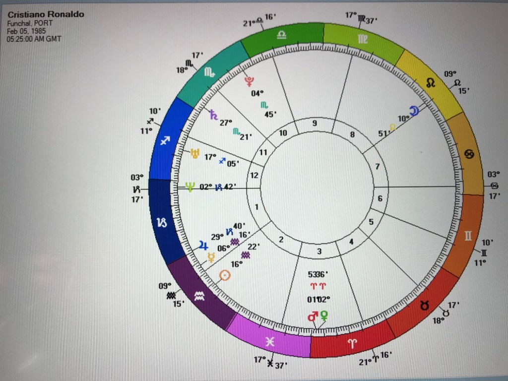♇Pluto occupies the 10th House in the 05:25 chart and is also in its ruling planet ♏Scorpio. ♇Pluto always carries great power, often dark, and where ♇Pluto is positioned in the chart tends to be the area of life where we experience great challenge and also confrontation. It can easily manifest as an obsession with success. This is a very strong position and may have been fundamental in Cristiano’s development.