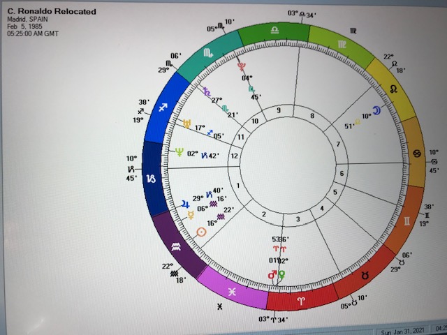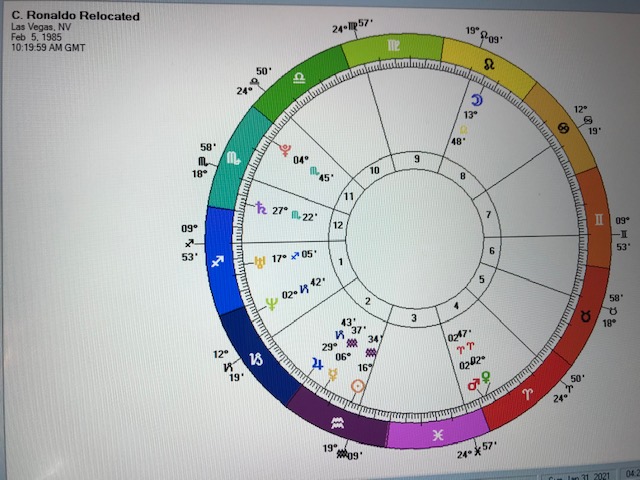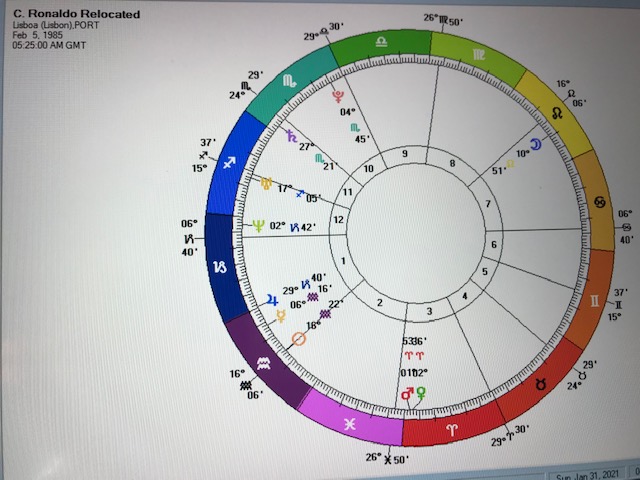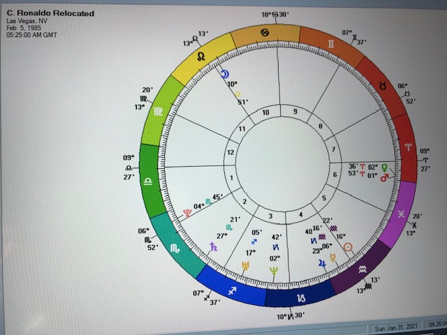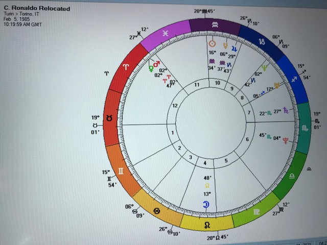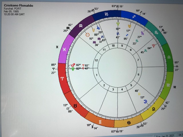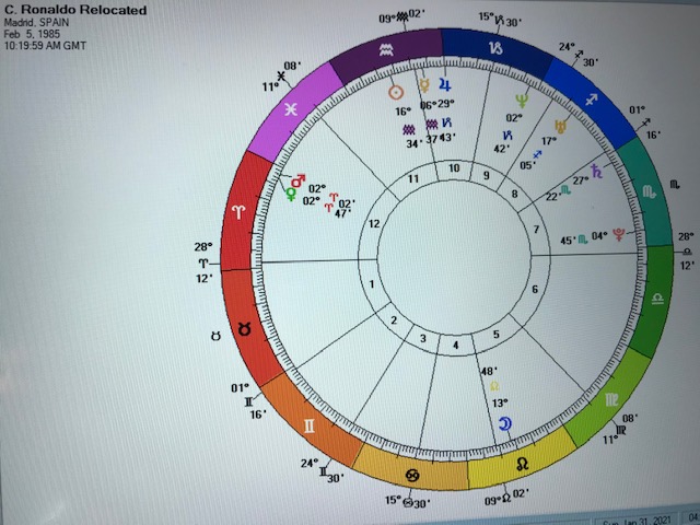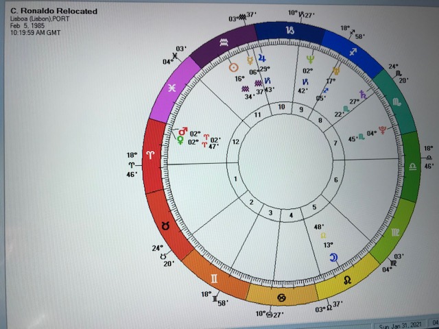After all that I almost found myself trying to identify what would be Cristiano’s most favourable location on earth. A few minutes effort on the 10:20 chart revealed that it would require several hours work. Even then it would likely be inaccurate without taking into account his romantic partner and children. I’ll wait until Cristiano pays the bill for that one.