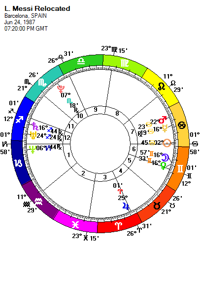 A birthchart is calculated for Barcelona, as if Lionel was born there, at exactly the same time, as he was born Rosario. You can see, the planets are still in the same position in relation to each other, but they have rotated from one numbered section to another.