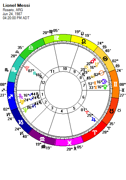 As well as a unique PARAN map we also have a unique birthchart showing the position of the planets at our moment of birth. For this example we’ll use the charts of Lionel Messi who is as well known as anybody these days. Wee Lionel, was born in Rosario, Argentina.